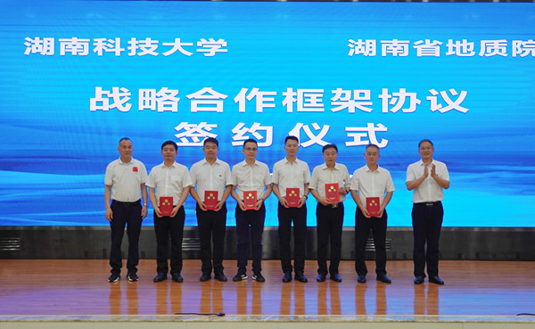 6月21日,湖南省地质院与湖南科技大学在湖南省地质院举行战略合作框架协议签订仪式。省地质院党委书记谈文胜、湖南科技大学校党委书记唐亚阳出席签约仪式并讲话,院党委委员、总工程师曹幼元,湖南科技大学副校长贺泽龙代表双方签署战略合作框架协议。院党委委员、副院长刘向明主持签约仪式。