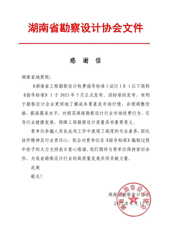 近日,湖南省勘察设计协会向省地质院发来感谢信,来信以“高度的专业素养、团队协作精神及行业责任心”,对我院在《湖南省工程勘察设计收费指导标准(试行)》(以下简称《指导标准》)编制工作中给予的支持表示感谢。