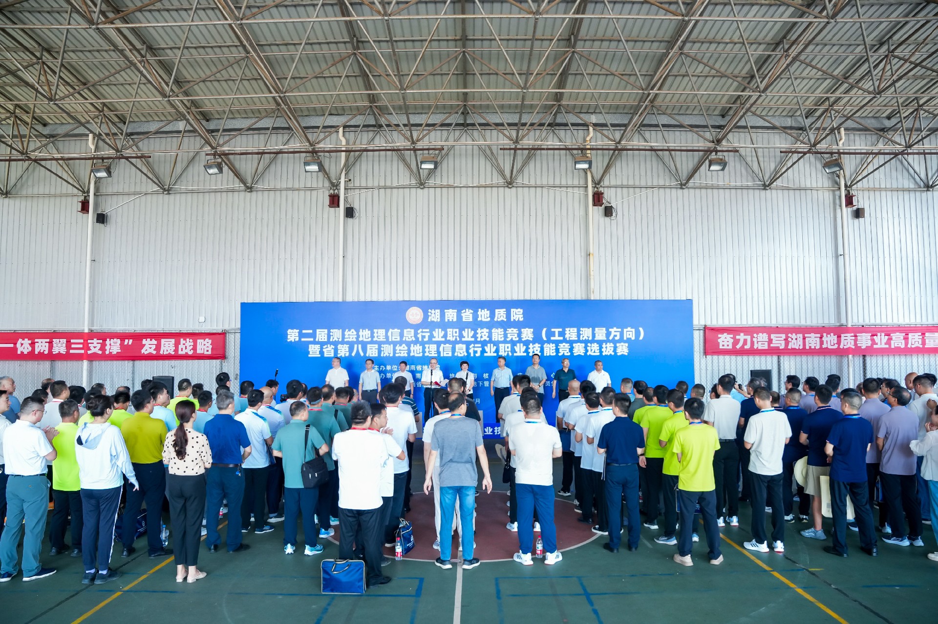 骄阳似火燃八月,测绘精英聚长沙。8月8日,湖南省地质院第二届测绘地理信息行业职业技能竞赛(工程测量方向)暨省第八届测绘地理信息行业职业技能竞赛选拔赛在长沙正式拉开帷幕。省地质院党委副书记、院长张皓在开幕式上致辞并宣布竞赛开幕,省测绘地理信息学会理事长王善明出席并讲话,省地质院党委委员、总工程师曹幼元主持开幕式,省自然资源厅国土测绘处副处长成勇翔参加。