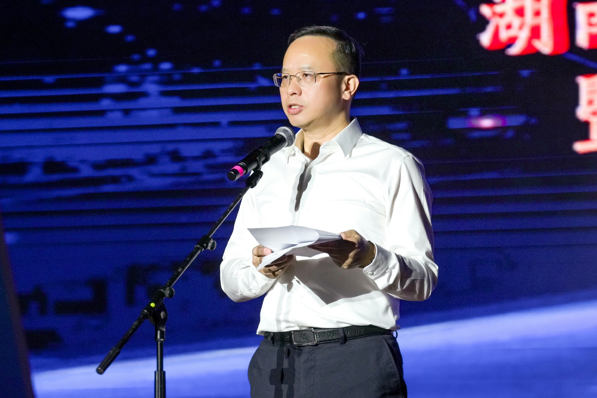 院党委书记谈文胜在致辞中表示,本次展演旨在纪念原子弹爆炸六十周年的热血征程,讴歌薪火传承的民族精神,缅怀地质前辈的卓越功勋,也标志着首届“湖南地质文化周”正式拉开序幕。他指出,我们要赓续文化血脉。地质工作者留下了“三光荣”“四特别”的精神内核,要感悟他们坚定不移的执着,聆听他们战天斗地的豪迈,追随他们舍己为公的奉献,昂首迈步湖南地质高质量发展新征程。我们要扎牢文化纽带。地质文化是镌刻在地质人心中的精神印记,要以鲜活的故事、生动的语言、多彩的符号,让全院上下拧成一股绳、聚成一束光、融成一块金,共同铸就新时代湖南地质的不朽传奇。我们要坚定文化自信。地质工作是探索未知、揭示真理的伟大征程,要进一步增强全院干部职工对地质工作的认同感、归属感和荣誉感,激扬地质人砥砺前行的昂扬斗志与辉煌未来。我们要厚植文化生态。要以文育人、以文促行、以文强院,把文化建设渗透到改革转型发展各方面,融入到“一体两翼三支撑”战略全过程,共同演奏湖南地质壮美乐章。同时,他祝愿本次“湖南地质文化周”圆满顺利,祝福湖南地质院的明天更加美好!
