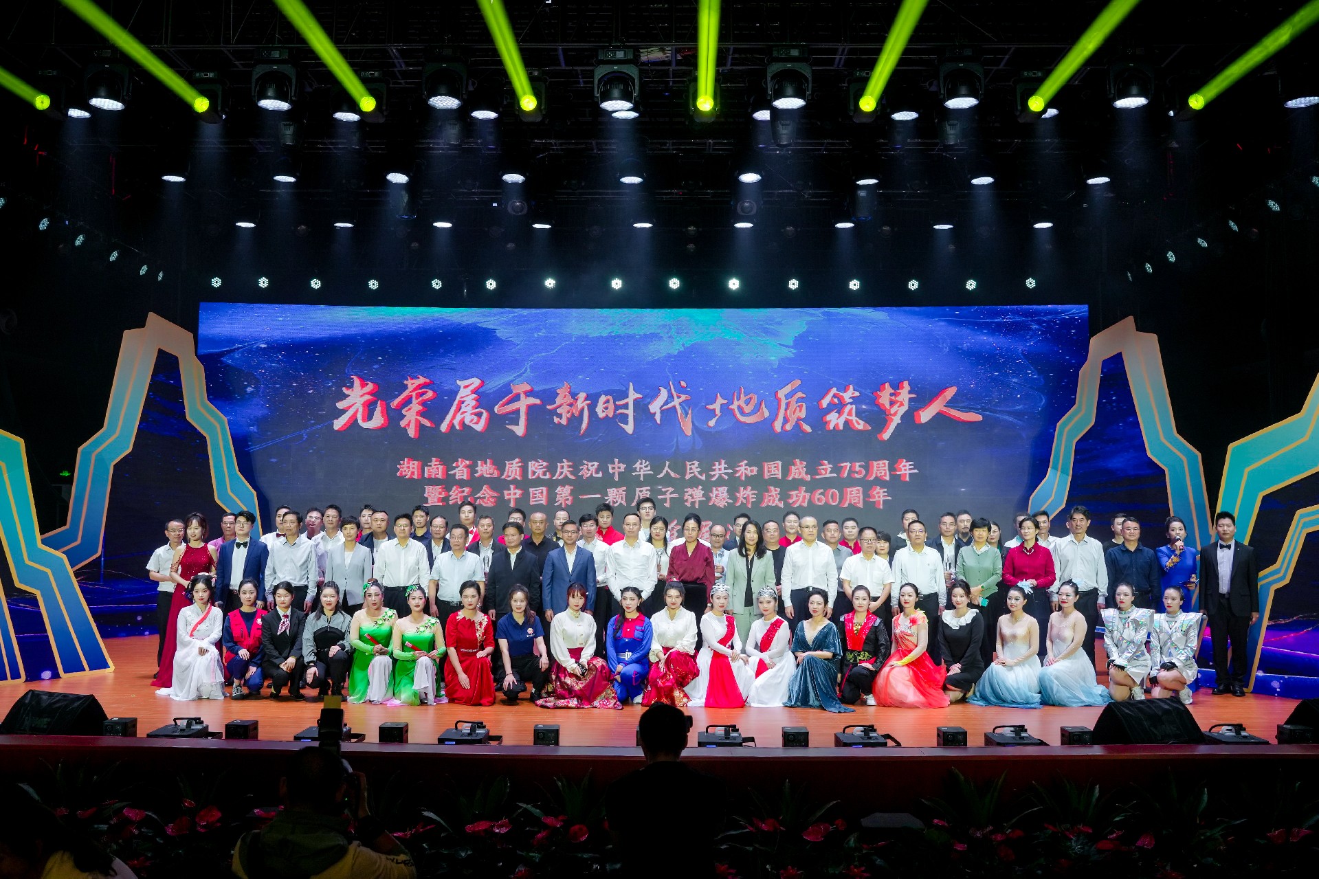 芙蓉国里尽朝晖,地质院中文艺萃。10月16日,湖南省地质院庆祝新中国成立75周年暨纪念第一颗原子弹爆炸60周年职工风采展演圆满举办。本次展演亦为“湖南地质文化周”启动仪式,湖南地质铀矿勘探陈列馆也于当日开馆,湖南地质文化甚浓,风景独好。省地质院党委书记谈文胜,省直机关工委委员、省直工会主席黎池,省自然资源厅党组成员、副厅长李定桥,省总工会党组成员、副主席刘再衡,长沙理工大学党委副书记方琼,团省委二级巡视员邓资益,叶爱斌等省地质院退休老领导,省财政厅、省纪委监委驻省自然资源厅纪检监察组、湖南工人报社相关领导,以及省地质院在家院领导出席展演活动。省部级劳模代表、职工代表1400余人共同观看演出,“湖南地质”微信视频号同步直播,观看人数达2.8万人,点赞次数达15.4万次,参与投票人数约1.2万人。